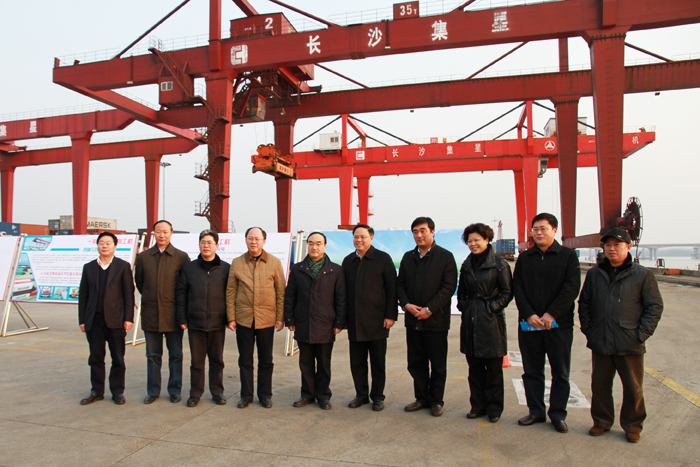2月10日下午,交通運(yùn)輸部黨組副書記、副部長(zhǎng)翁孟勇一行,在省交通運(yùn)輸廳黨組書記、廳長(zhǎng)賀仁雨,長(zhǎng)沙市委副書記、市長(zhǎng)張劍飛,市政府副市長(zhǎng)何寄華,市政府秘書長(zhǎng)、辦公廳主任唐志浩,市政府副秘書長(zhǎng)嚴(yán)鳳枝,市交通運(yùn)輸局黨委書記朱東鐵,局長(zhǎng)劉明理,副局長(zhǎng)姚仲權(quán)、陳湘,開福區(qū)區(qū)委書記張迎春,區(qū)長(zhǎng)凌勤杰等領(lǐng)導(dǎo)陪同下,來(lái)到長(zhǎng)沙新港考察調(diào)研。湖南長(zhǎng)沙新港有限責(zé)任公司董事長(zhǎng)、三期工程建設(shè)指揮部指揮長(zhǎng)石道國(guó),董事、常務(wù)副總經(jīng)理唐忠良,董事趙赤書,副總經(jīng)理張韜,長(zhǎng)沙集星集裝箱碼頭有限公司副總經(jīng)理辛華,總經(jīng)理助理周勇接待。 在長(zhǎng)沙新港集裝箱碼頭上,三期工程建設(shè)指揮部副指揮長(zhǎng)、新港公司副總經(jīng)理張韜介紹了長(zhǎng)沙新港一、二期工程運(yùn)營(yíng)情況,匯報(bào)了三期工程建設(shè)規(guī)模及建設(shè)情況。翁孟勇副部長(zhǎng)強(qiáng)調(diào):長(zhǎng)沙新港變化一次比一次大,當(dāng)前要借助湖南加大水運(yùn)發(fā)展力度的有利契機(jī),加快樞紐、港口和湘江2000噸級(jí)航道提升建設(shè),更好地服務(wù)經(jīng)濟(jì)社會(huì)和航運(yùn)的持續(xù)發(fā)展。 |