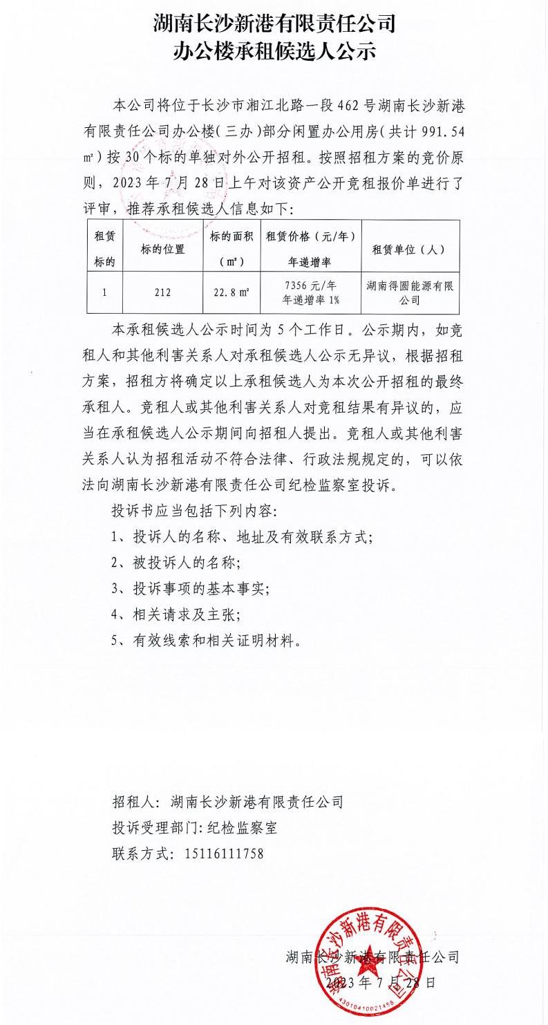 湖南長(zhǎng)沙新港有限責(zé)任公司辦公樓承租候選人公示