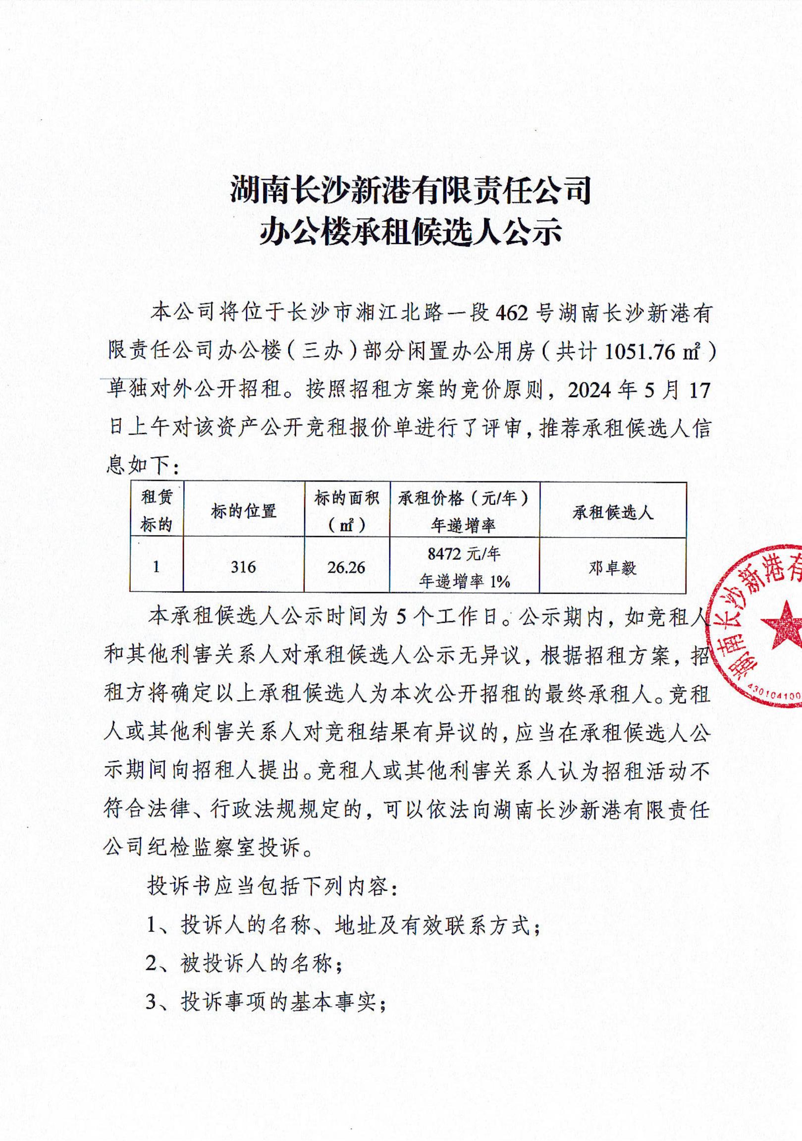 湖南長沙新港有限責(zé)任公司辦公樓承租候選人公示